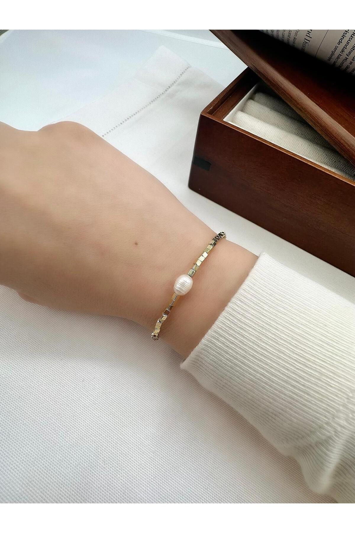Gold Kare Plaka Detaylı Barok İnci 14K Bileklik
